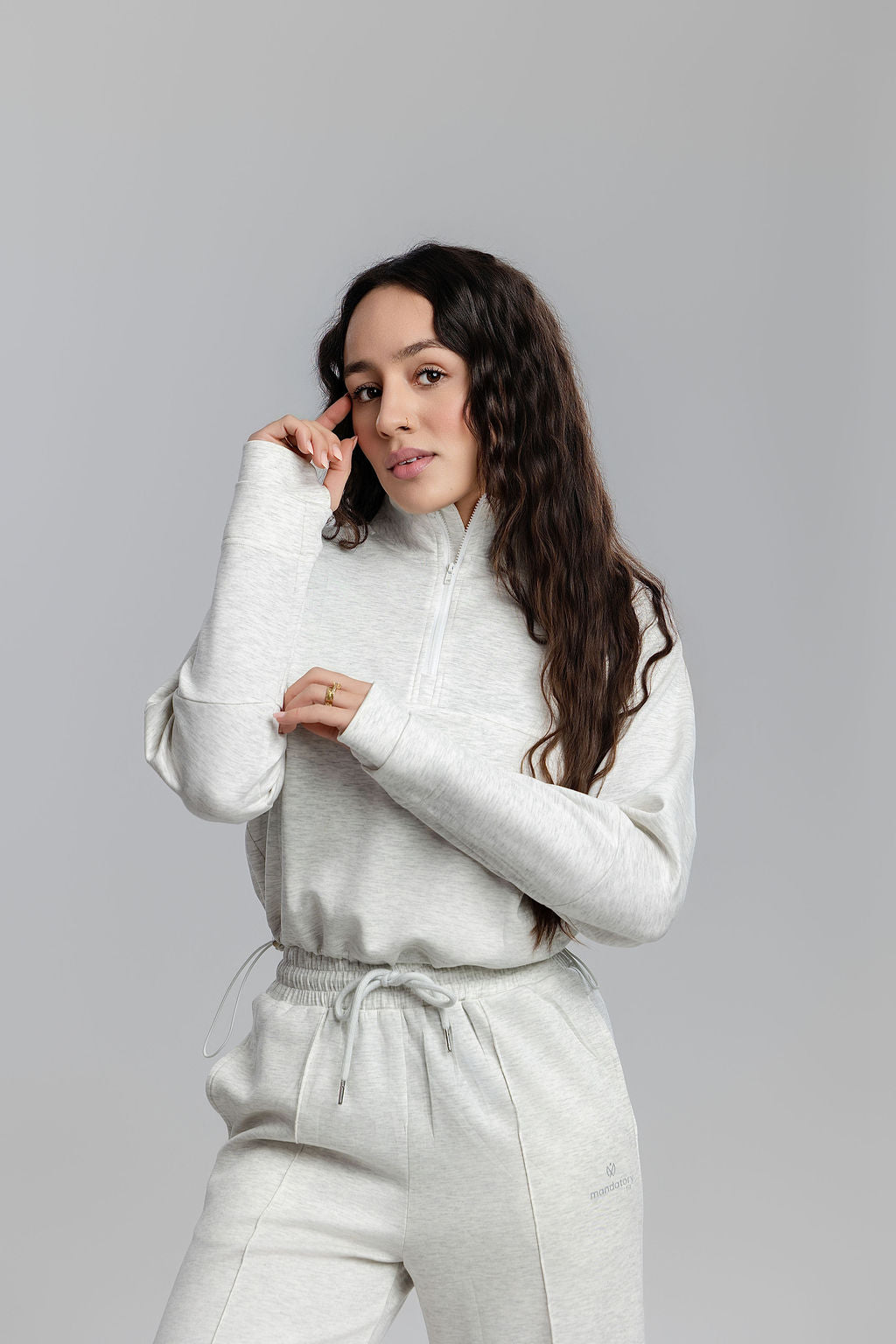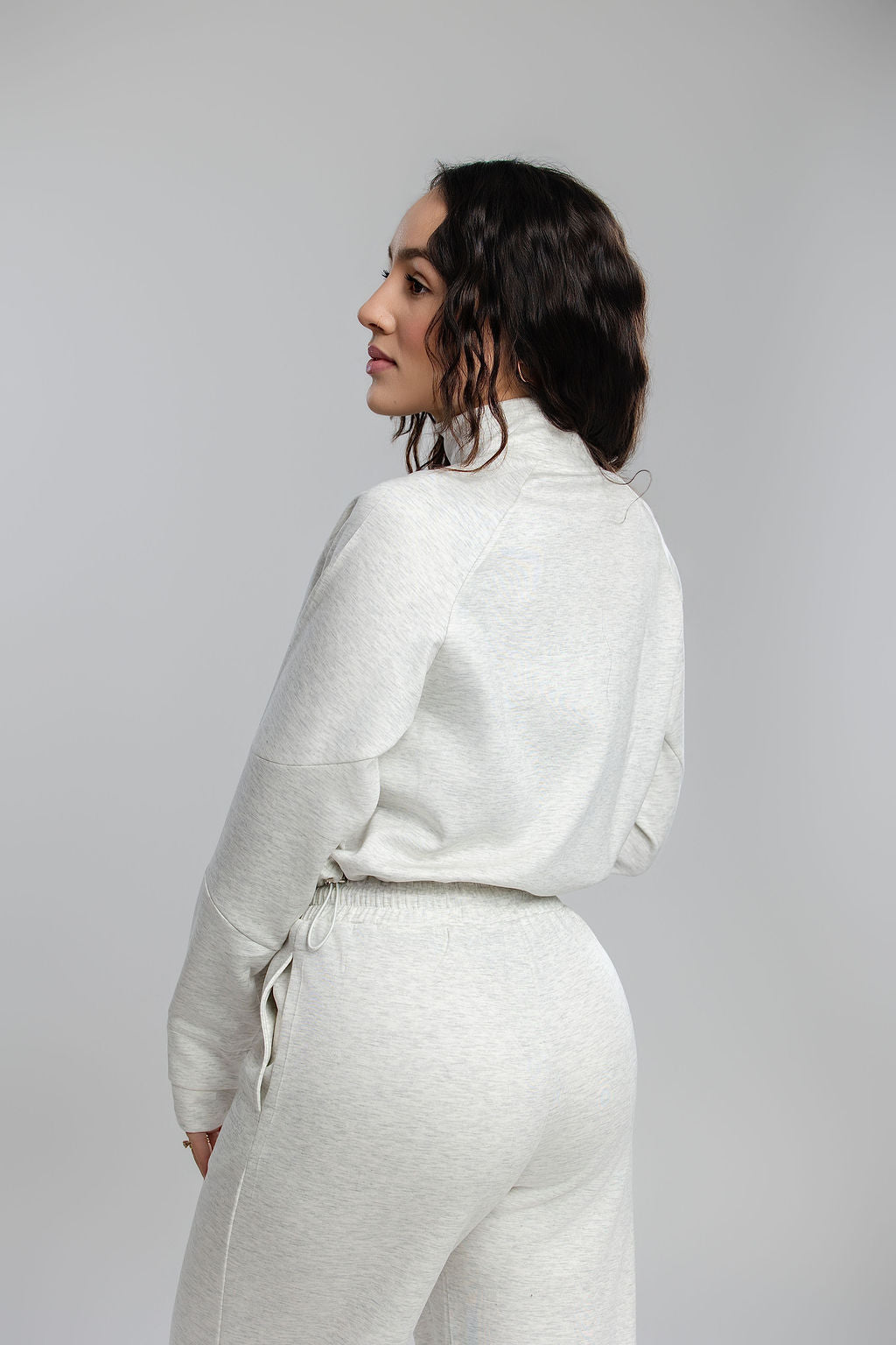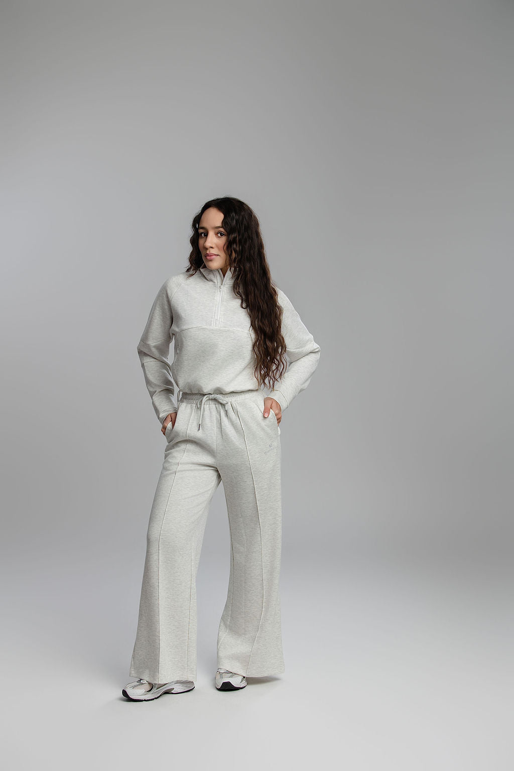 The cropped half-zip sweater features slopping shoulders for a relaxed, modern look. The wide-leg pants include a high-waist fit and adjustable drawstring for the perfect silhouette.