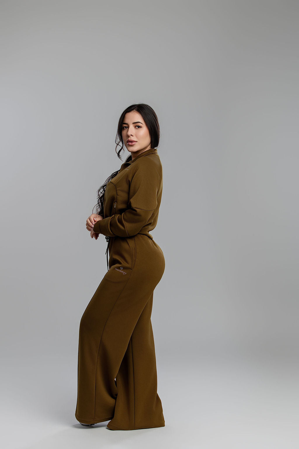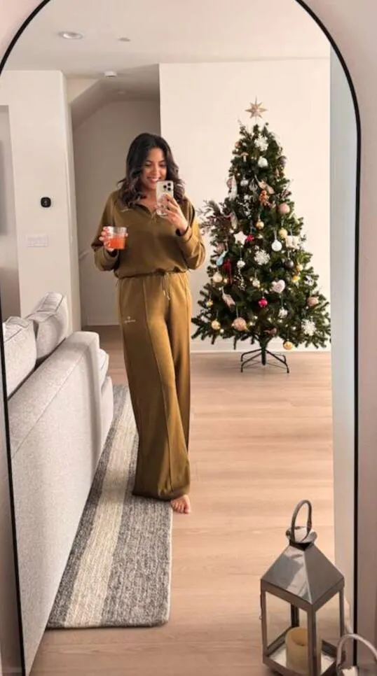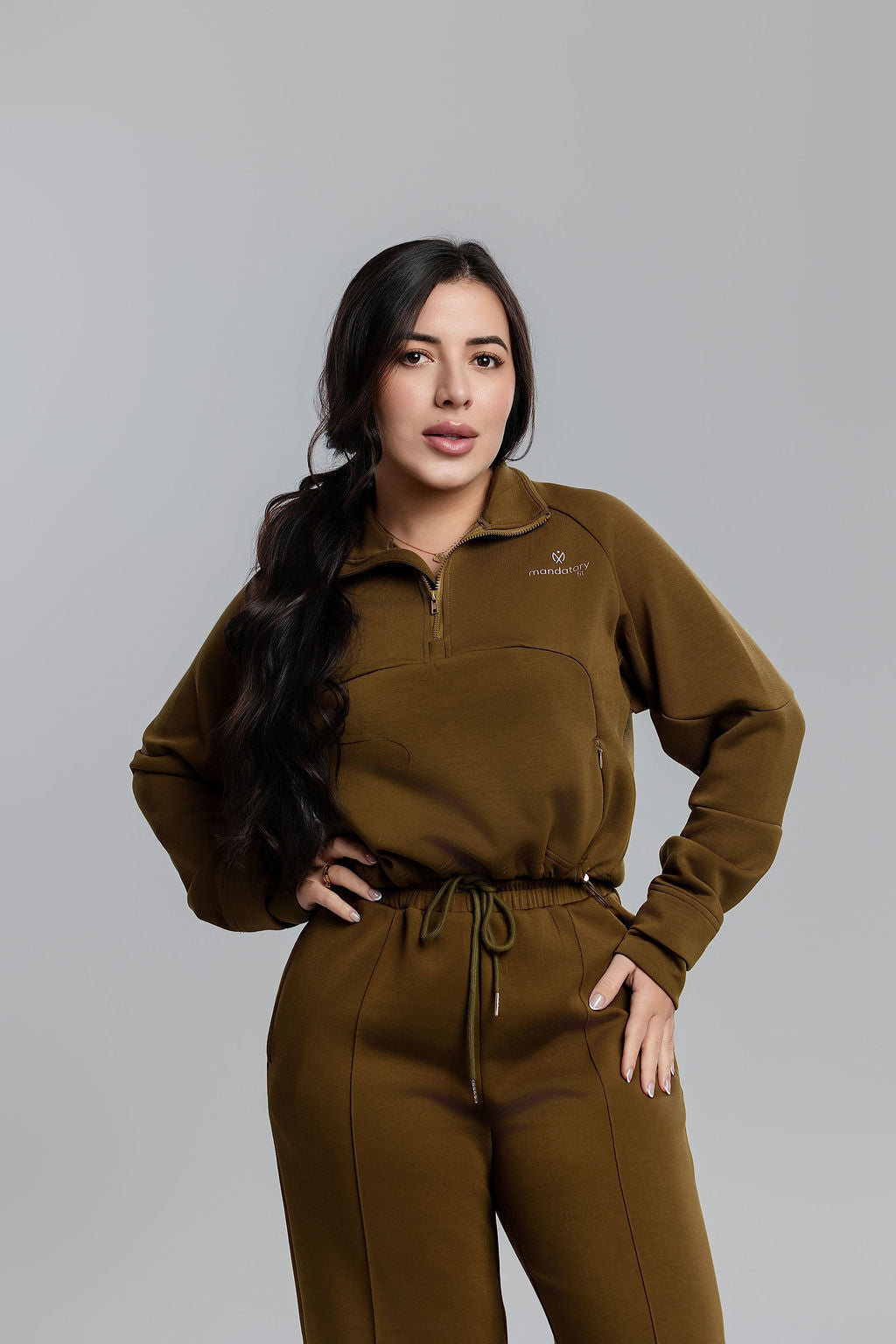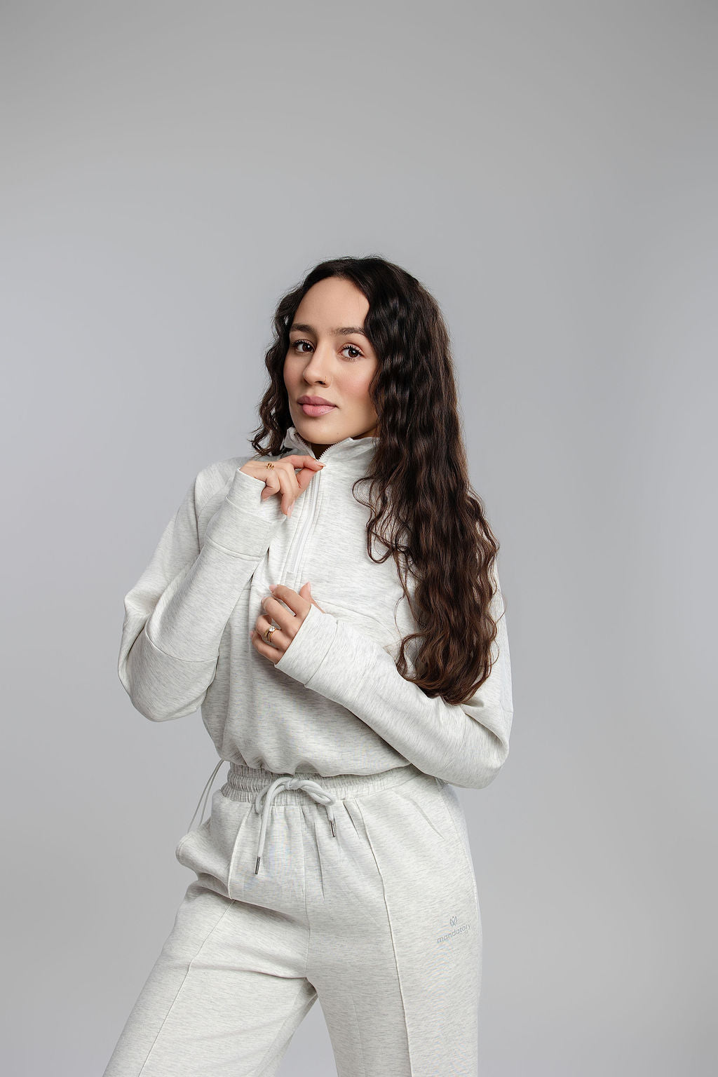 The cropped half-zip sweater features slopping shoulders for a relaxed, modern look. The wide-leg pants include a high-waist fit and adjustable drawstring for the perfect silhouette.