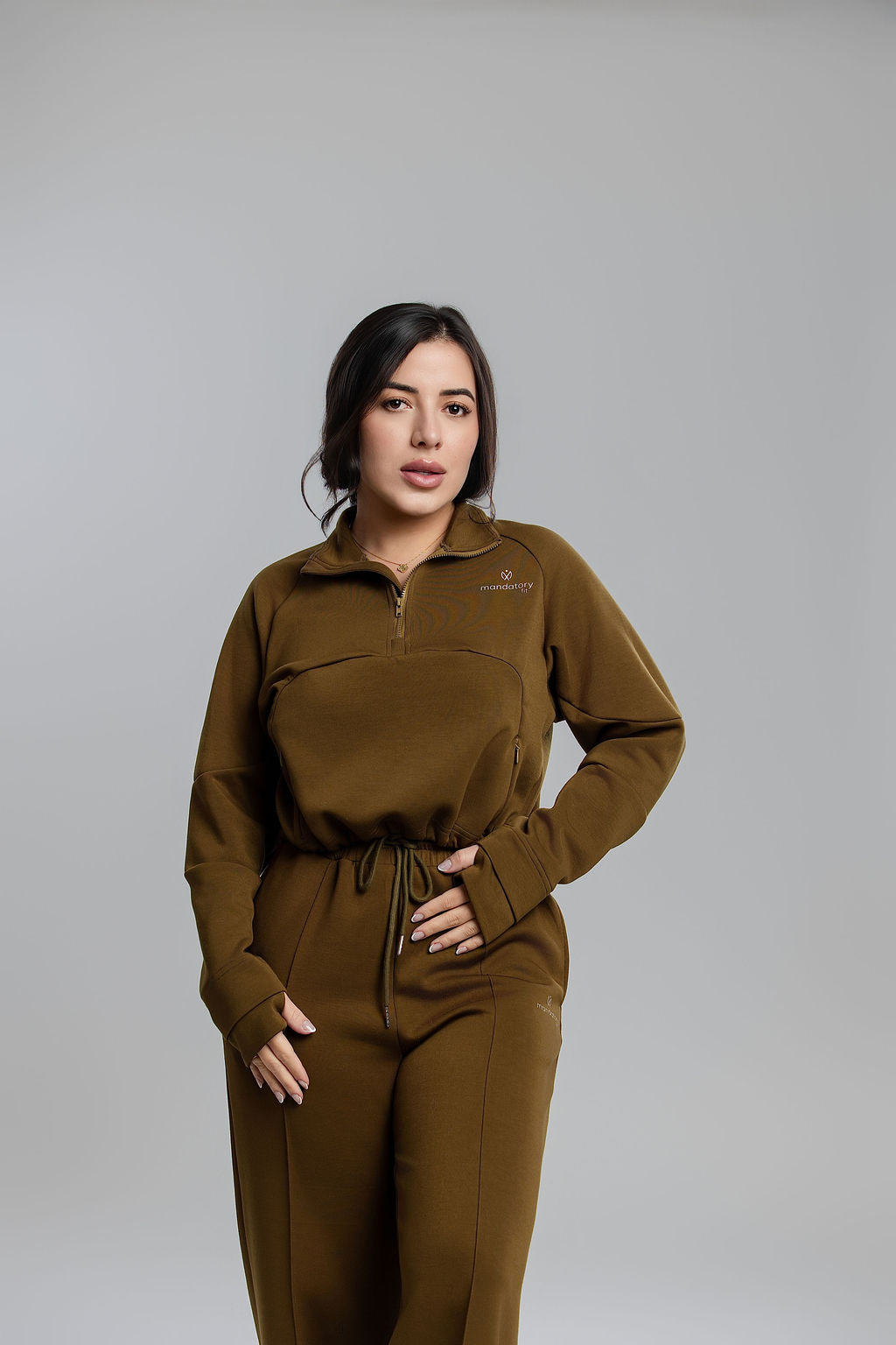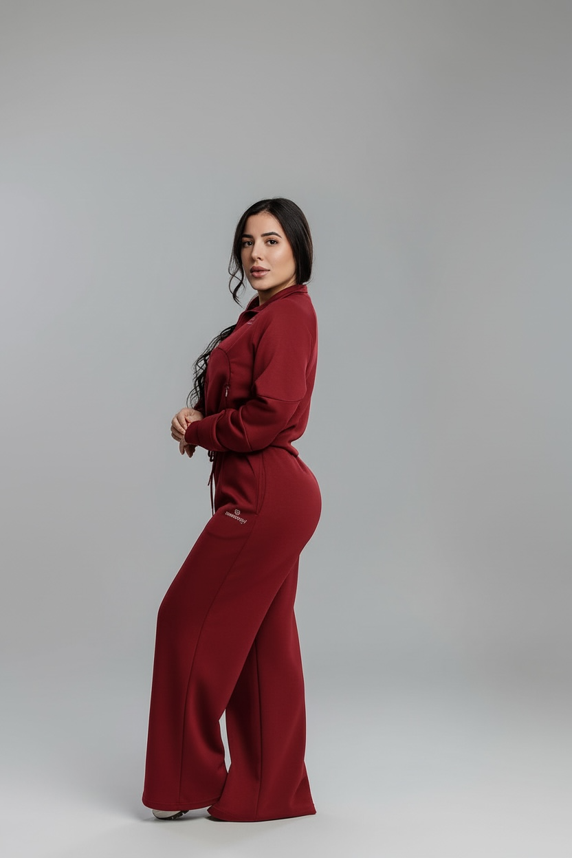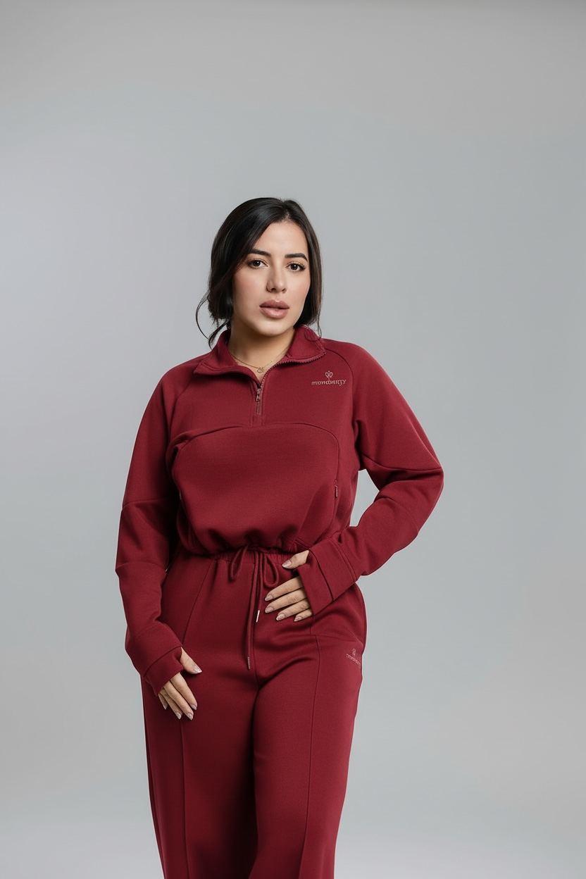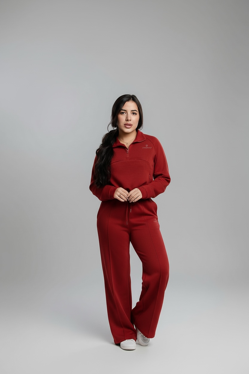 Design: Half-zip crop sweater, high-waist wide-leg pants, adjustable drawstring waistband, zipper pocket, sports finger covers.
